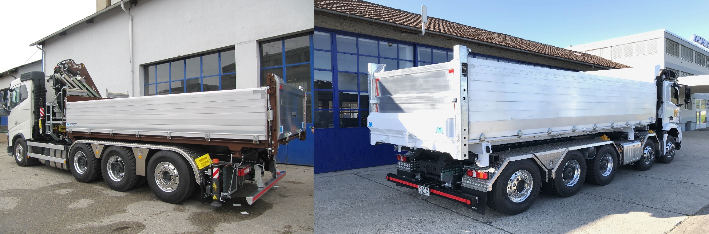 Deux nouvelles bennes sur les routes, avec ouverture de ridelle hydraulique par un vérin frontal ainsi qu’un verrouillage hydraulique intégré dans les montants.