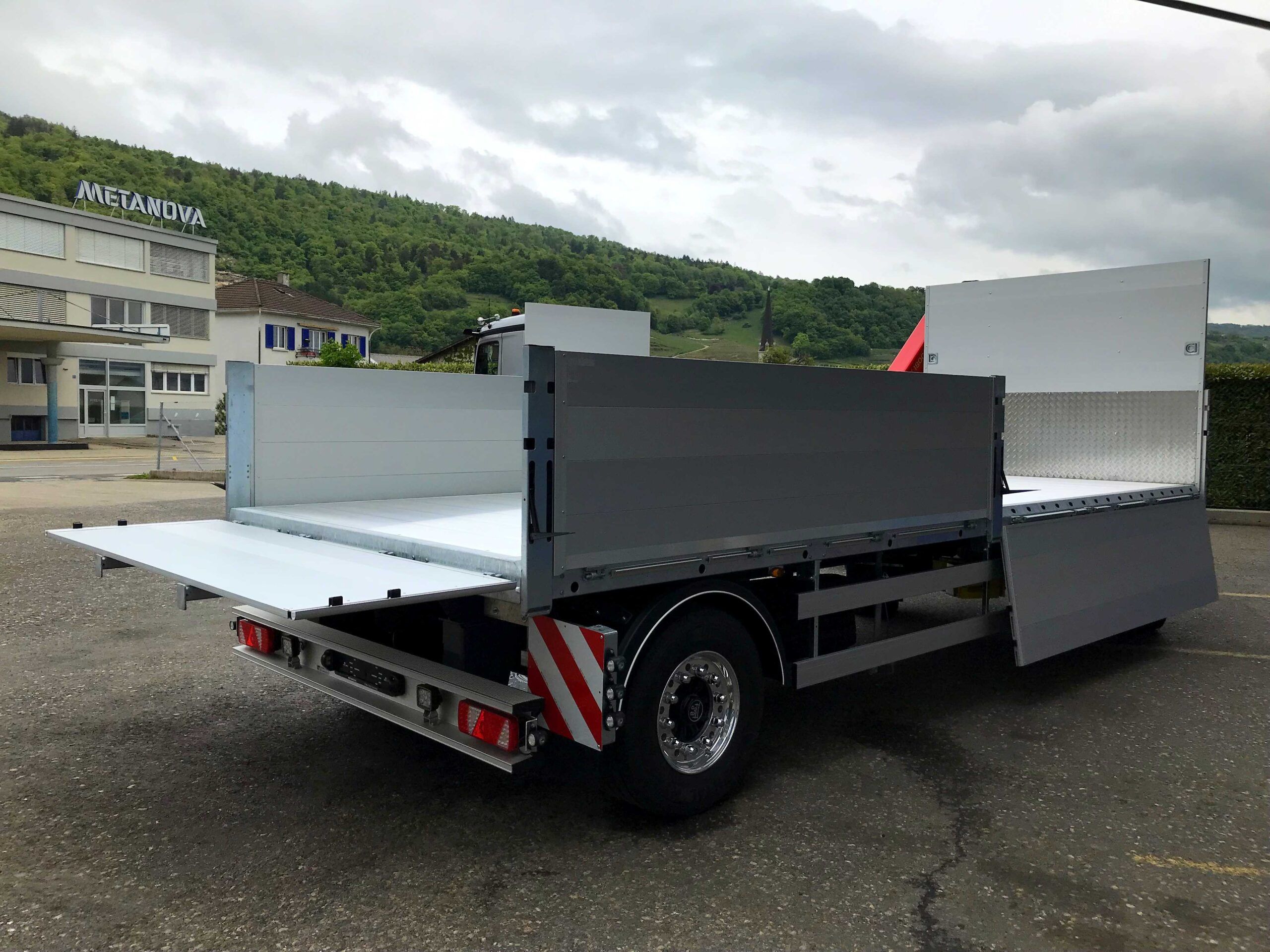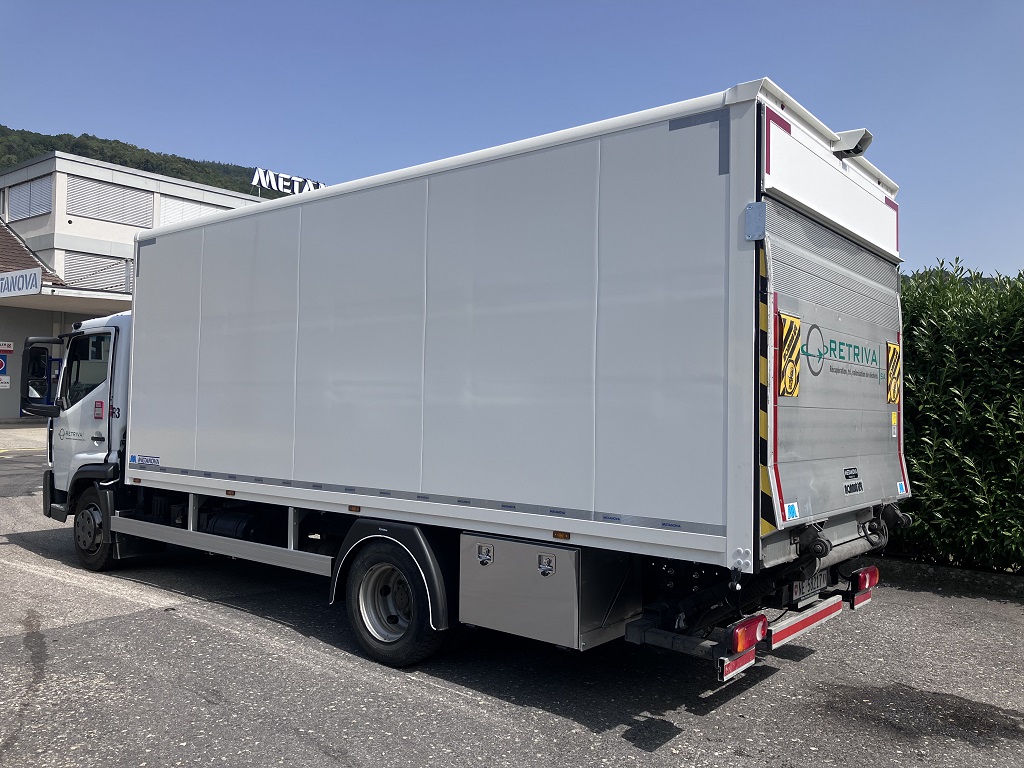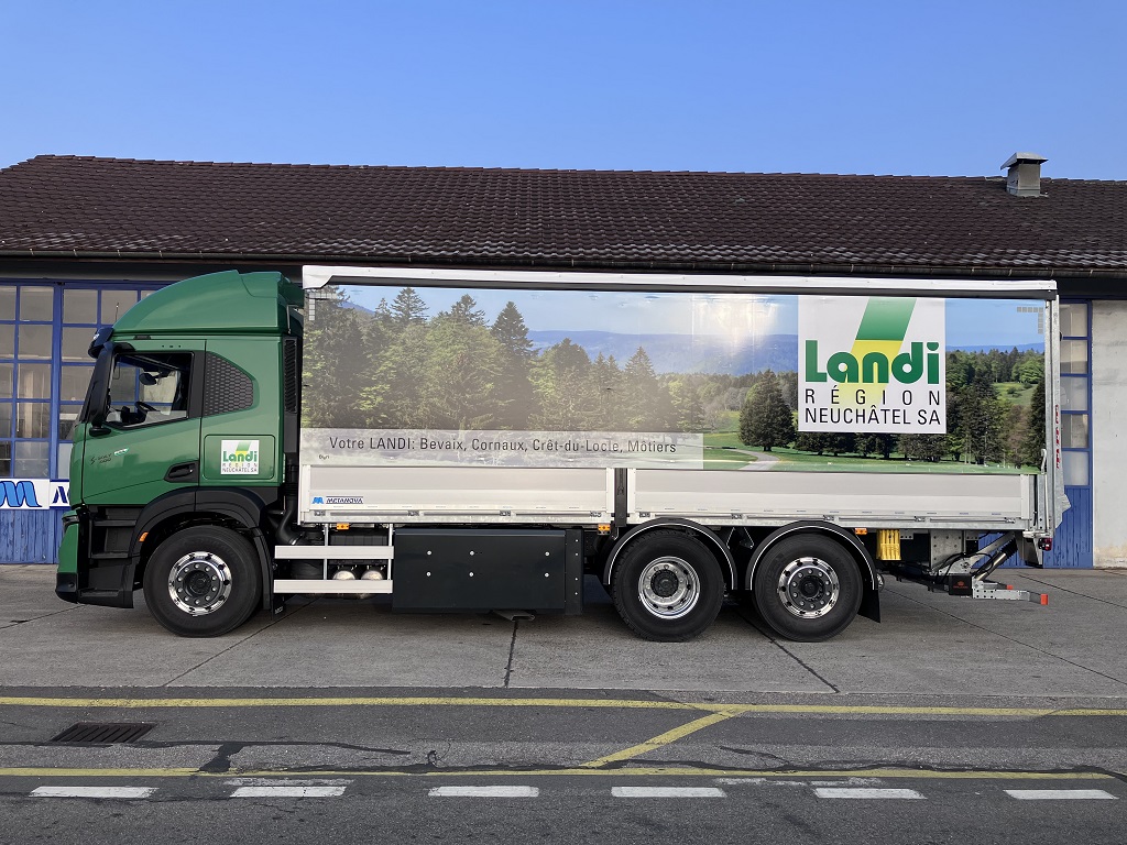Nouvelle « première en Suisse » pour ce véhicule muni de 2 ridelles élévatrices latérales, car cette fois-ci le châssis est à entraînement électrique.