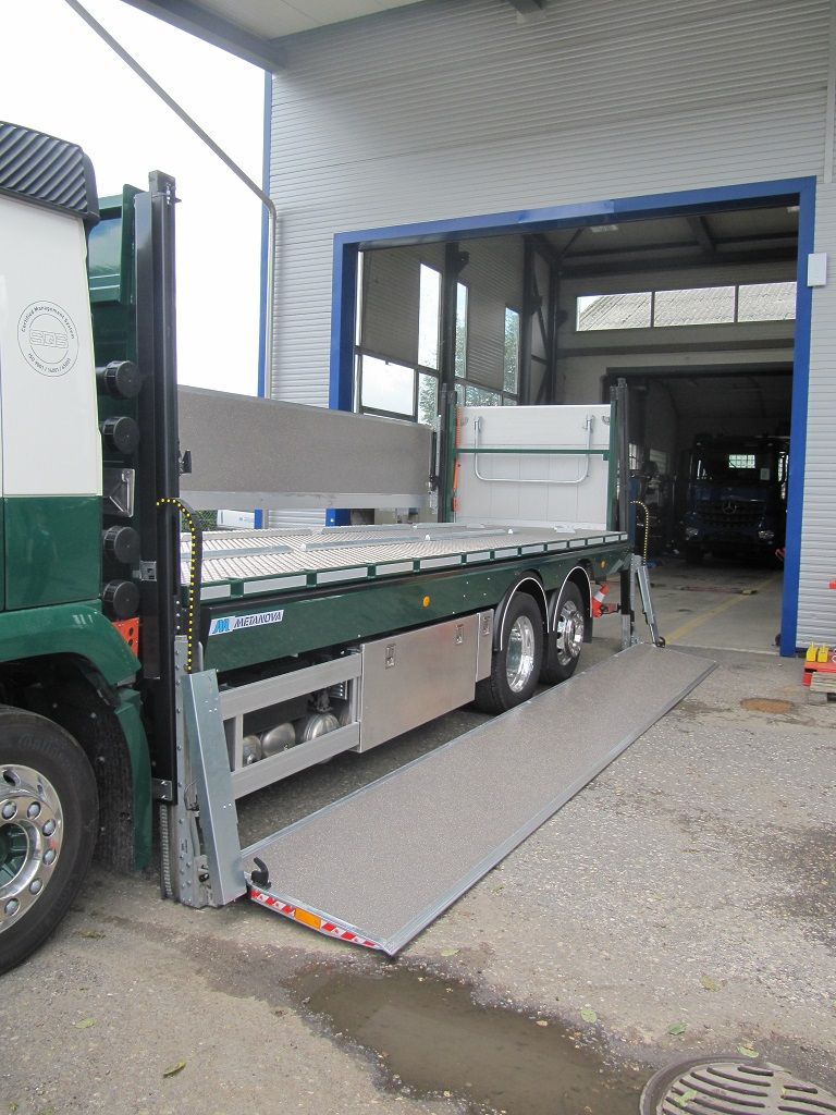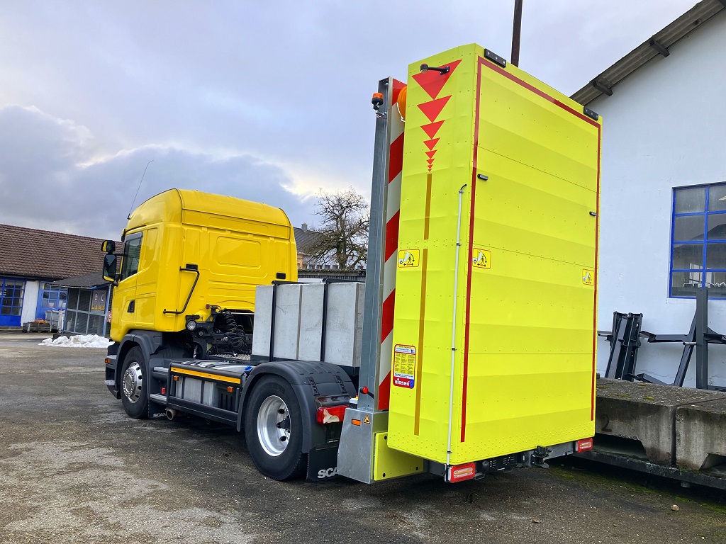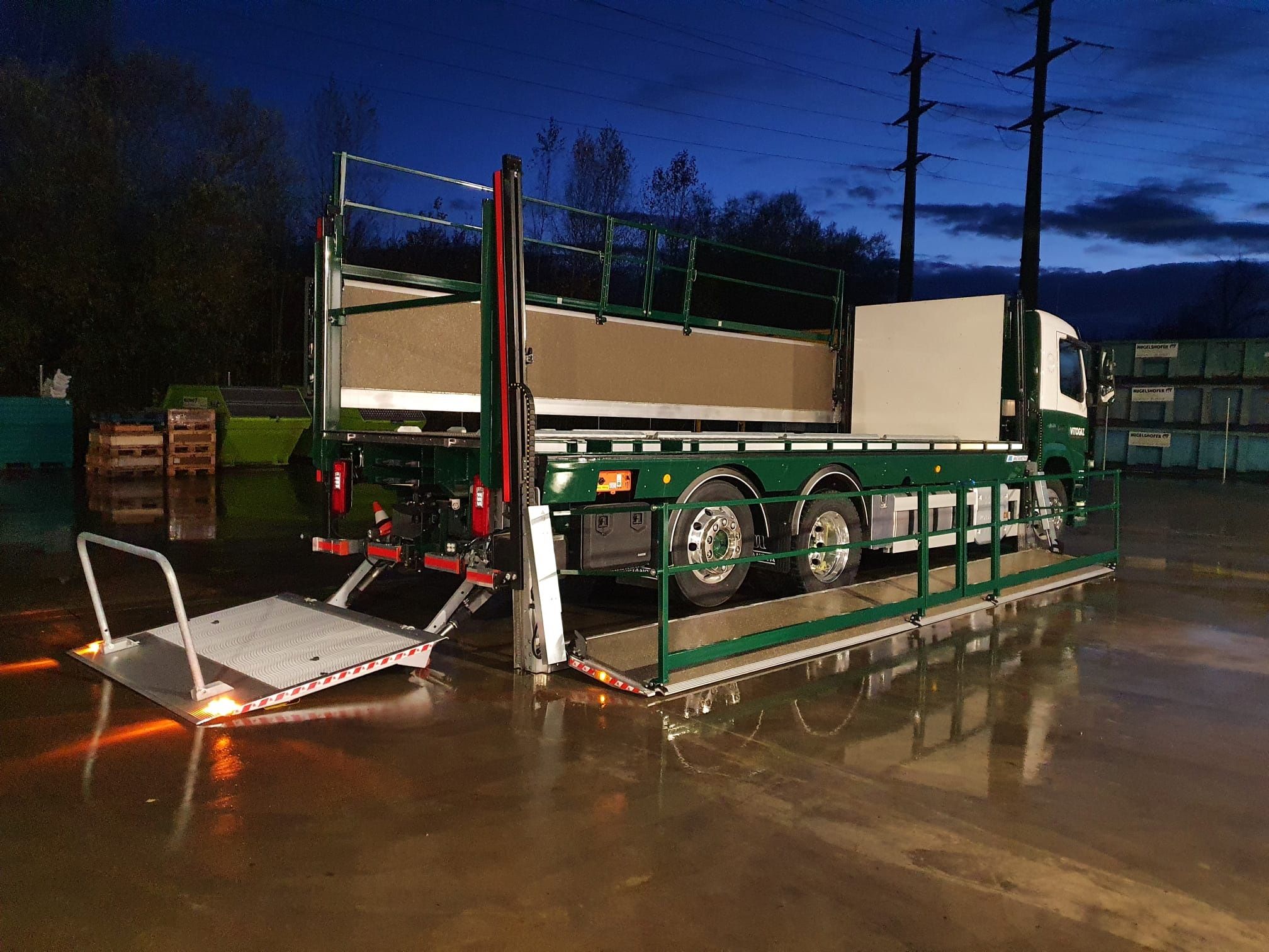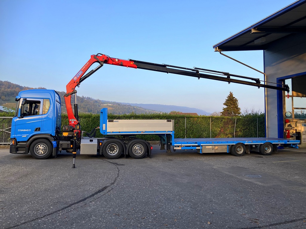 Nouvelle « première en Suisse » pour ce véhicule muni de 2 ridelles élévatrices latérales, car cette fois-ci le châssis est à entraînement électrique.